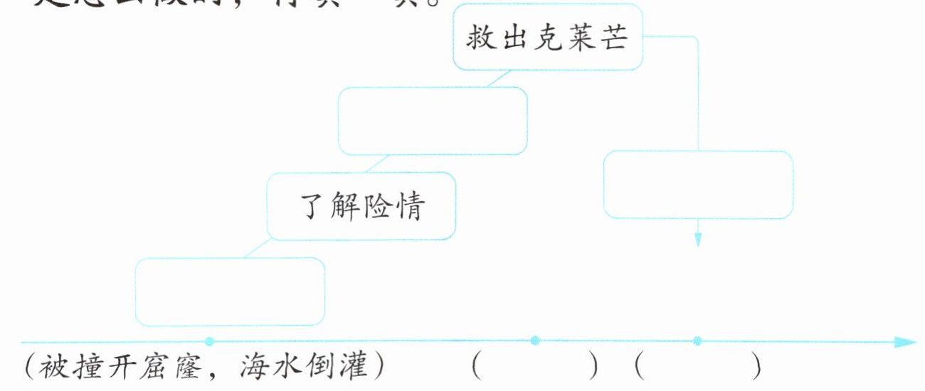 根据课文内容,“诺曼底号”遇难后,哈尔威船长首先了解险情(被撞开窟窿,海水倒灌),接着指挥救援(组织乘客和船员有序撤离),最后救出克莱芒,自己与船共存亡。因此,中间两个空依次为“指挥救援”“与船共存亡”。