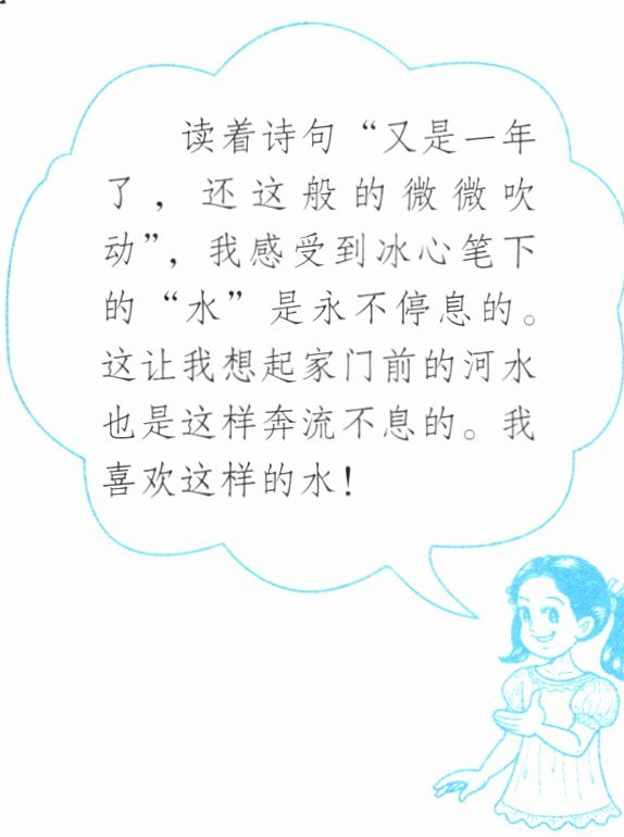 答案:1. 读冰心《春水》,从“又是一年了,还这般的微微吹动”和春水“未曾留下一个影子”,感受到水的永不停息和自然循环,像流动的生命,充满活力。