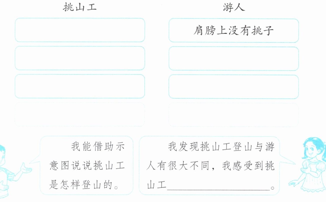2. 读课文,先想一想挑山工是怎样登山的,与游人登山有什么不同,再照样子填一填。