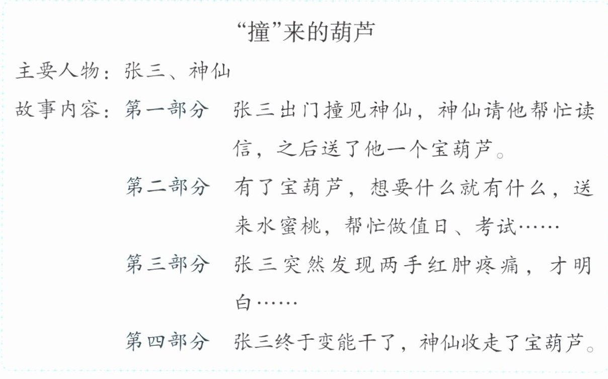(3)有了宝葫芦,“要什么有什么”,真是太奇妙了。联系第(2)题,选一个故事,参考下面的示例,创编故事,讲给同学听。