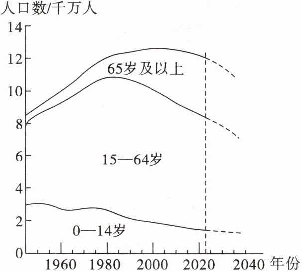 护理机器人的使用已成为老龄化阶段解决养老问题的重要手段之一。读日本人口年龄构成变化图(含预测),完成 6~8 题。