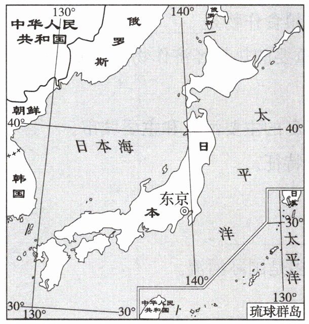 (2) 根据日本位置示意图,描述日本的地理位置: