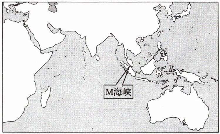 海峡是指两个水域之间的狭窄水上通道,是海上交通要道、航运枢纽,交通位置非常重要。读 M 海峡位置图,完成 2~3 题。