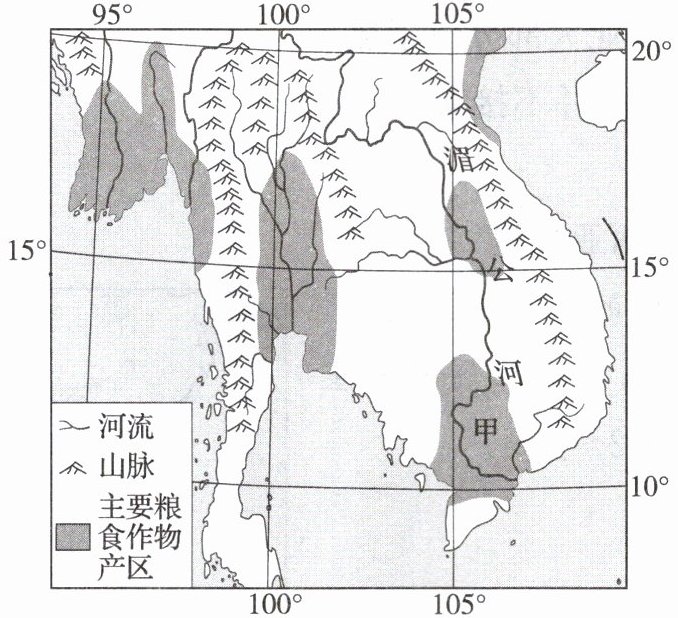 (2024·山东潍坊中考)中南半岛是世界上人口稠密地区之一,也是世界重要的热带经济作物种植基地之一。读中南半岛主要粮食作物产区图,完成 6~7 题。