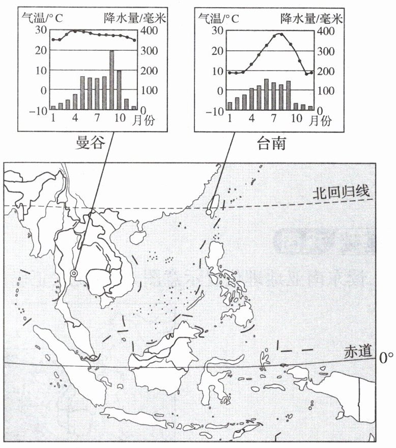 答案:4~5. 4. C 5. D 解析 第 4 题,读曼谷气温曲线与降水量柱状图可知,曼谷全年高温,降水多,但降水季节分配不均,有明显的旱季和雨季,符合热带季风气候的特征。第 5 题,读图可知,曼谷比台南纬度更低,热量更充足,降水更多。