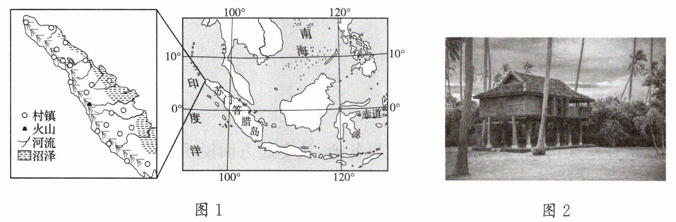 (2024·甘肃武威中考)读东南亚部分区域图(图 1)和苏门答腊岛传统民居图(图 2),完成 10~12 题。