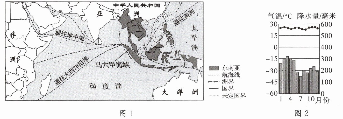 13. (2024·陕西中考)东南亚热带水果种类多,全年鲜果不断,产量及出口量大。近年来,我国进口的热带水果主要来自东南亚。读东南亚位置及海上航线示意图(图 1)和东南亚热带水果主产区的气温曲线与降水量柱状图(图 2),完成下列各题。