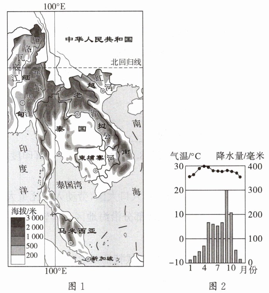 14. (选做题)中国与东南亚山水相连,人文相通。某地理兴趣小组运用资料探究中南半岛的河流与其他地理要素的关系。读中南半岛局部简图(图 1)和中南半岛气温曲线与降水量柱状图(图 2),完成下列各题。