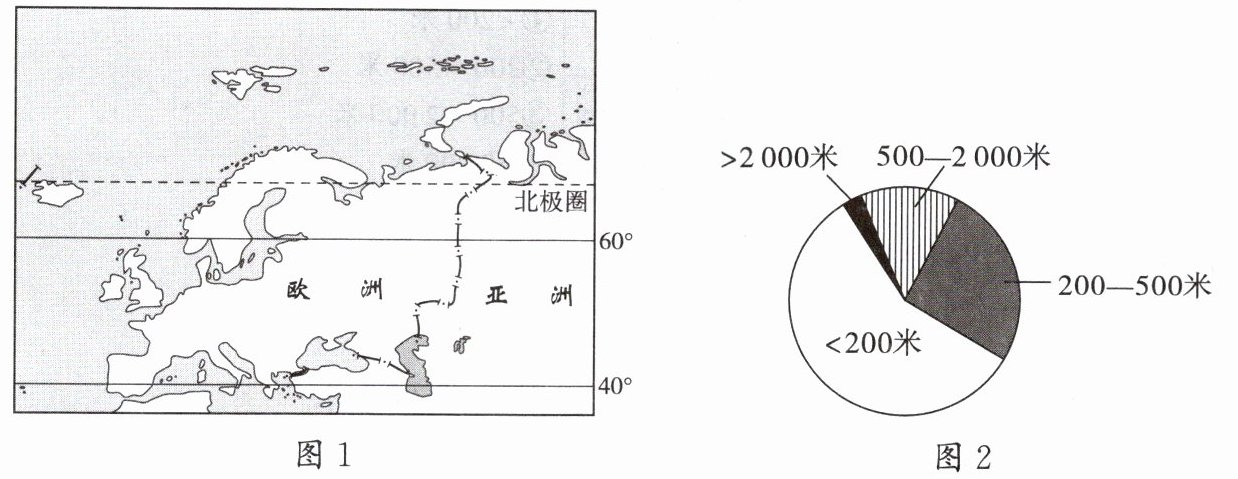 读欧洲地理位置示意图(图1)和欧洲不同海拔范围的陆地占全洲面积的比例图(图2),完成7~8题。