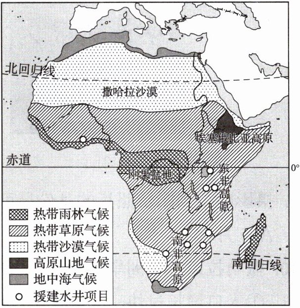 答案:5~6.5.D 6.A 解析 第5题,援建水井项目分布地区的气候类型主要是热带草原气候,全年高温,分干、湿两季,因此遇到的困难可能是阳光暴晒,蚊虫叮咬。第6题,援建水井项目可以缓解当地人畜饮水困难。