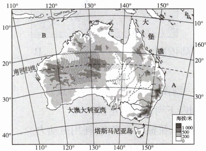 (2)澳大利亚地势东西高,中间低。(