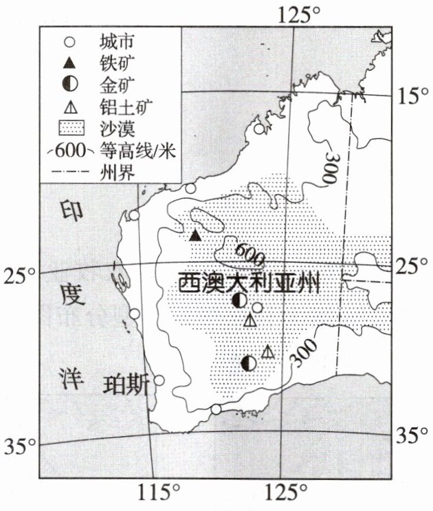 西澳大利亚州多沙漠和盐湖,蕴藏着丰富的矿产资源,是澳大利亚面积最大、原始自然景观最丰富的一个州。读西澳大利亚州区域图,完成 12~13 题。