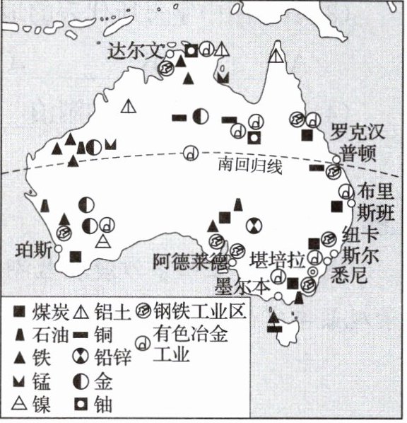 右图是澳大利亚矿产资源分布示意图。读图,完成 16~17 题。