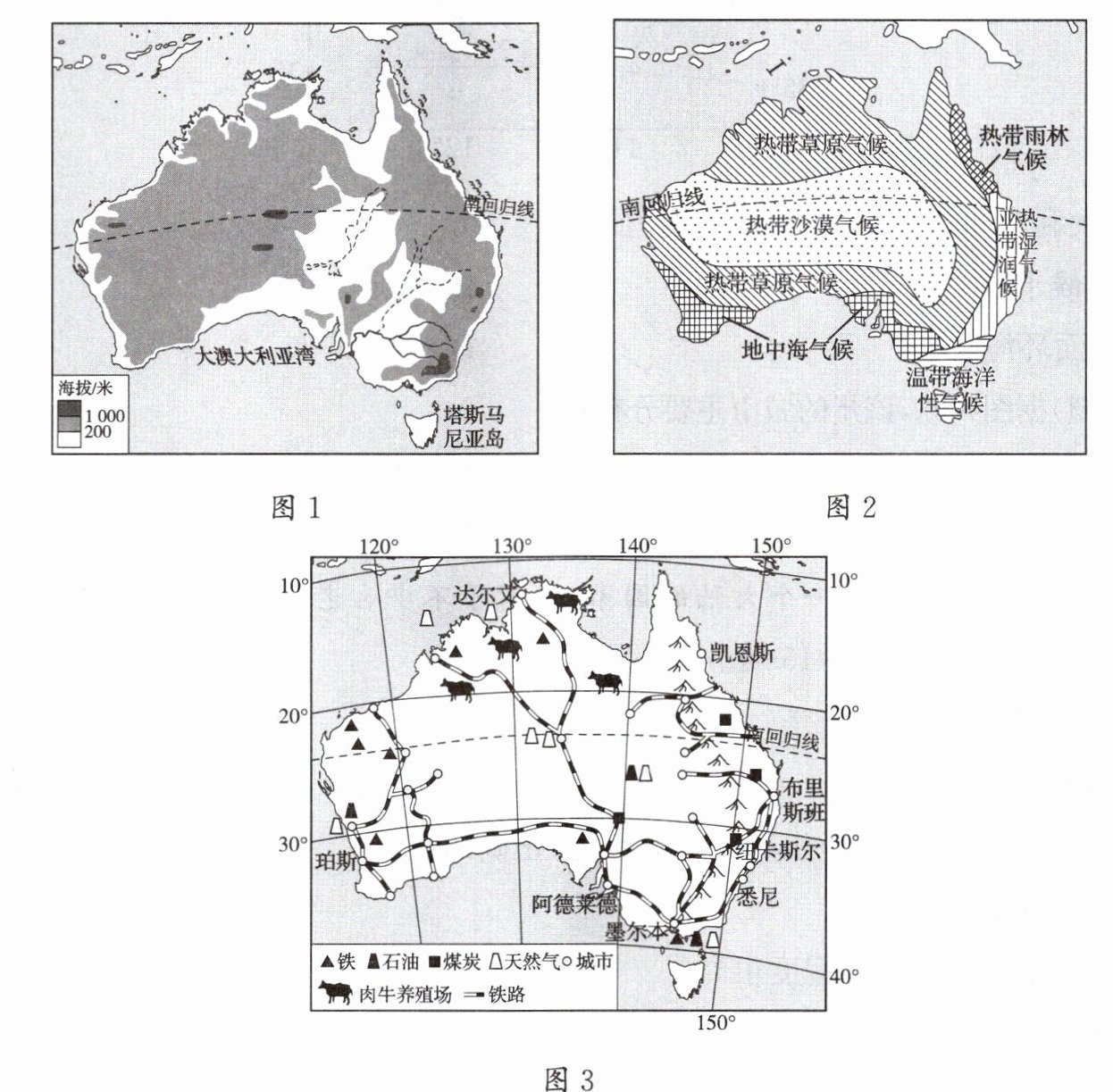 18. (选做题)澳大利亚是南半球经济最发达的国家,农牧业、采矿业为澳大利亚传统产业。图 1 为澳大利亚地形图,图 2 为澳大利亚气候类型分布图,图 3 为澳大利亚铁路、矿产、肉牛养殖场分布图。读图,完成下列各题。