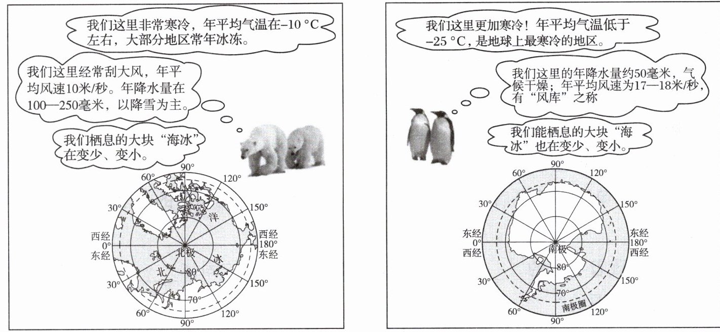 极地地区的自然环境非常特殊,有着极高的科学考察价值。下图为北极熊与企鹅之间的对话。据此完成 1~3 题。