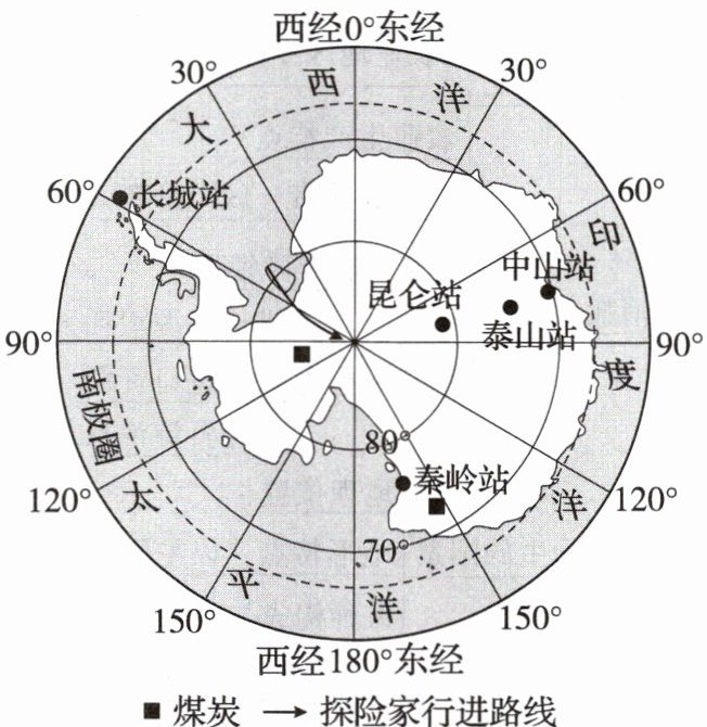 解析 第(1)题,昆仑站位于南半球,其纬度约为 80°S;昆仑站位于南极圈内,北半球冬至日太阳直射点位于南回归线,南极圈内出现极昼现象。第(2)题,煤是深埋在地下由古代植物经过漫长的时间演化而形成的,现在科学家在南极地区发现煤炭资源,说明南极大陆很久以前在气候温暖的区域,纬度较低,气温较高,降水较多,生长着茂密的森林,植被覆盖率较高,经过大陆漂移才到现在的位置。第(3)题,南极地区的气候特点是烈风、严寒、干燥;根据气候特点携带合适的防护用品即可。