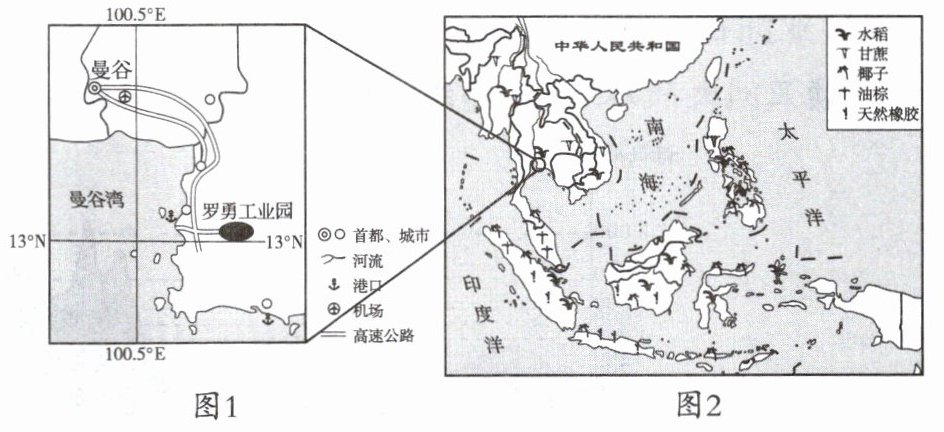 2023 年 11 月 5 日,第六届中国国际进口博览会在上海开幕。泰国组织了多家企业参展。泰中罗勇工业园是中国首批境外经济贸易合作区之一。读罗勇工业园位置示意图(图 1)和东南亚地区主要物产分布图(图 2),完成 9~11 题。