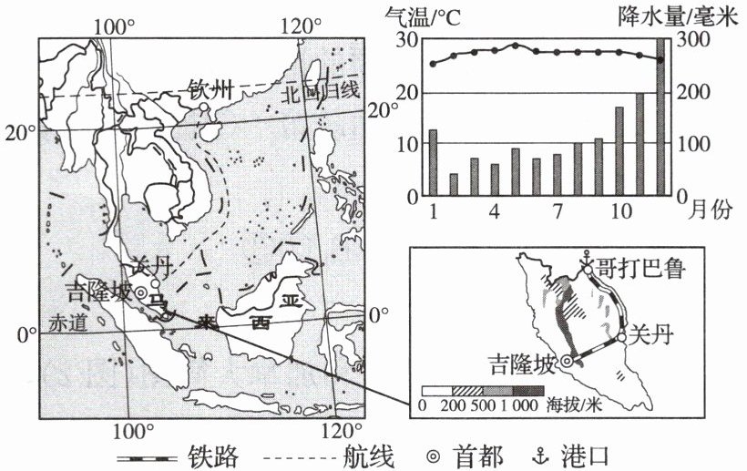 17. 马来西亚是与中国共建“一带一路”的重要合作伙伴。右图为马来西亚周边地区、马东铁路示意图及关丹气温曲线和降水量柱状图。阅读图文材料,完成下列各题。