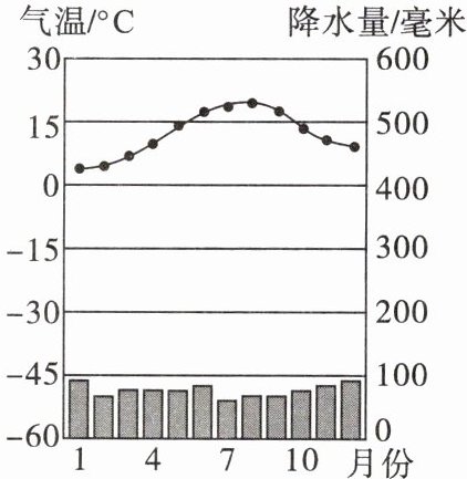 读伦敦多年平均各月气温和降水量图,完成6~7题。