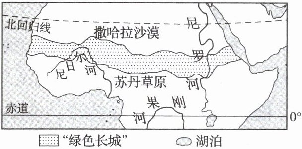 撒哈拉沙漠南缘的国家正联手打造一条横穿非洲大陆的“绿色长城”,“绿色长城”总长度为7700千米,宽15千米。读“绿色长城”示意图,完成8~9题。