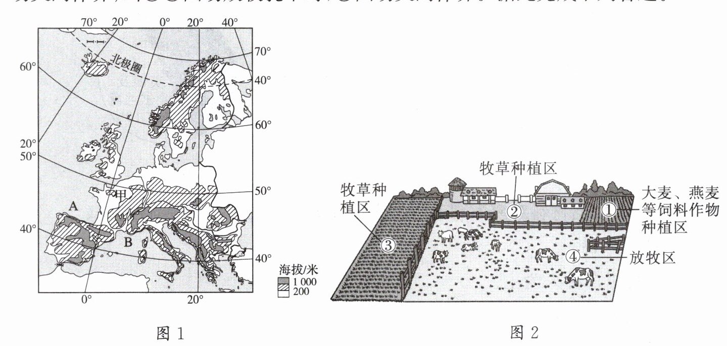 解析第(1)题,图1中A是大西洋;甲地位于40°N—50°N,为五带中的北温带,其地形类型为平原,利于海洋上的暖湿气流深入内陆,由此推断甲地的气候为温带海洋性气候,特征是全年温和湿润。第(2)题,图1中B是地中海。赞成。地中海位于亚欧板块与非洲板块碰撞挤压地带,面积会不断缩小,甚至消失。第(3)题,当④围场放牧乳牛时,②围场关闭休养;当②③围场放牧乳牛时,④围场关闭休养。这样有利于牧草生长,合理调整各种用地规模,促进农场可持续发展。第(4)题,结合所学知识,从旅游资源、经济、交通、政策等方面分析欧洲西部发展旅游业的优势。