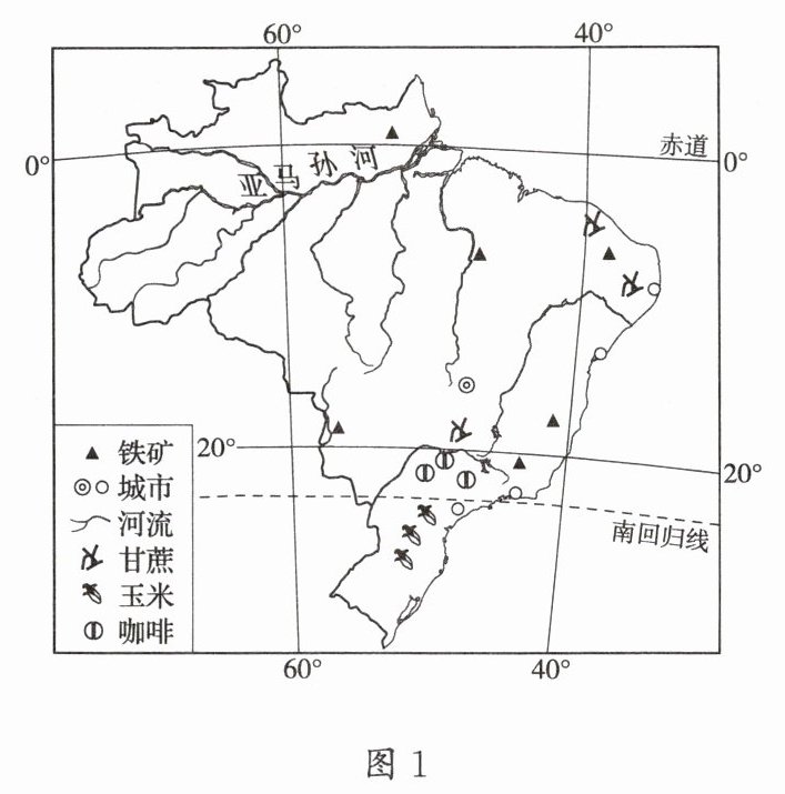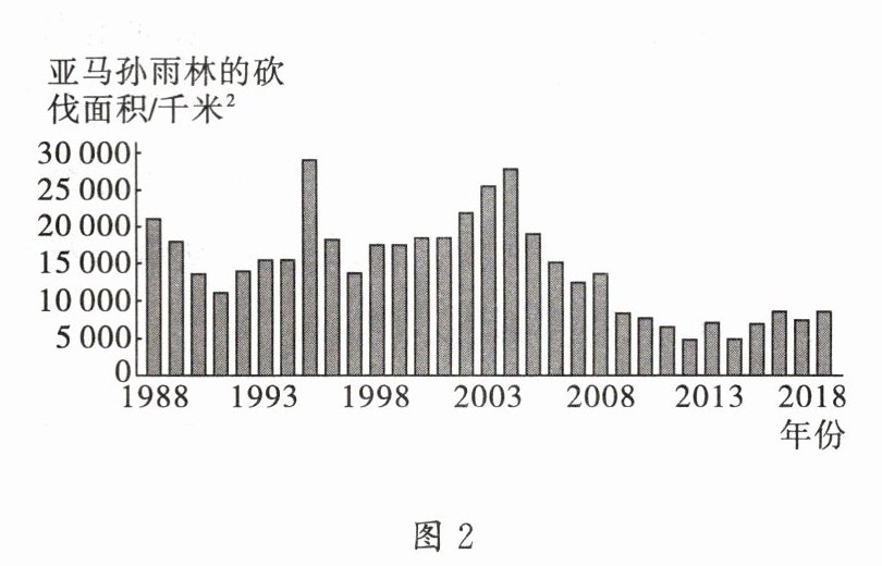素有“地球之肺”之称的亚马孙热带雨林约 $60\%$ 位于巴西境内。读巴西示意图(图 1)和 1988—2018 年亚马孙雨林砍伐面积统计图(图 2),完成 10~12 题。