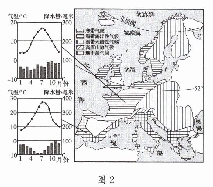 某中学地理兴趣小组开展了“制定欧洲西部暑假期间旅游攻略”的学习活动。同学们搜集欧洲西部自然环境和社会经济的相关资料,规划出三条旅游路线(见下表),并从气候、美食、景点三个方面进行分组制作攻略。图1为欧洲西部国家分布图,图2为欧洲西部气候类型图及温带海洋性气候和地中海气候的气候资料图。