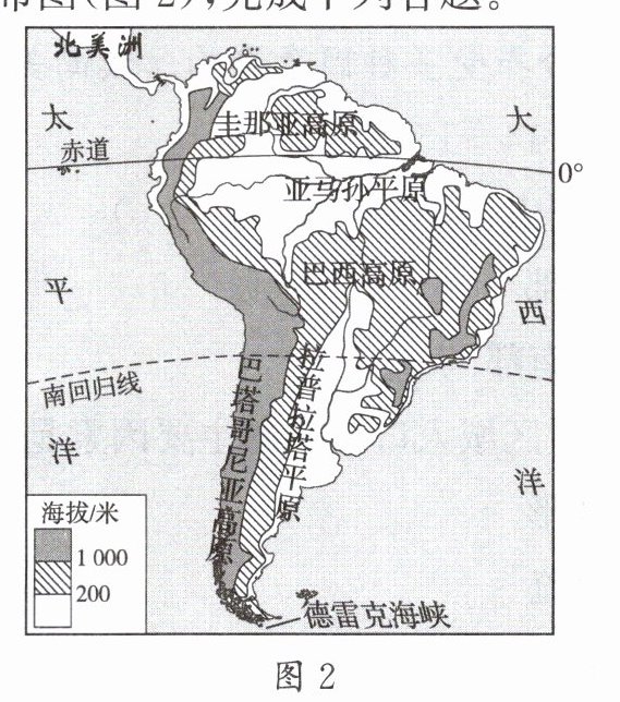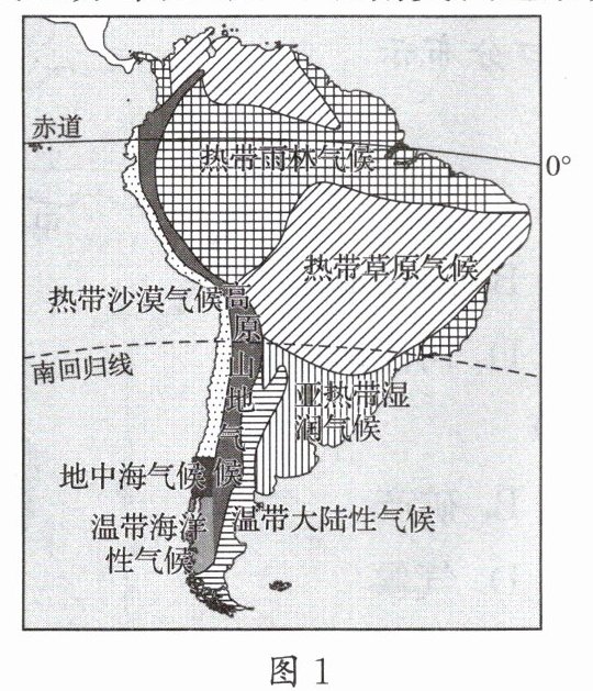 17. 通过区域地理的学习,我们掌握了分析一个大洲地理特征的思路和方法。读南美洲气候类型分布图(图1)和南美洲地形分布图(图2),完成下列各题。