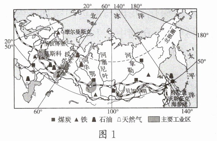答案:答案(1)莫斯科 本州岛 太平 俄罗斯 俄罗斯 日本 俄罗斯 (2)北冰洋 南高北低 (3)资源型 太平洋沿岸及濑户内海沿岸 便于获取原料 管道运输和海洋运输 (4)高技术产业