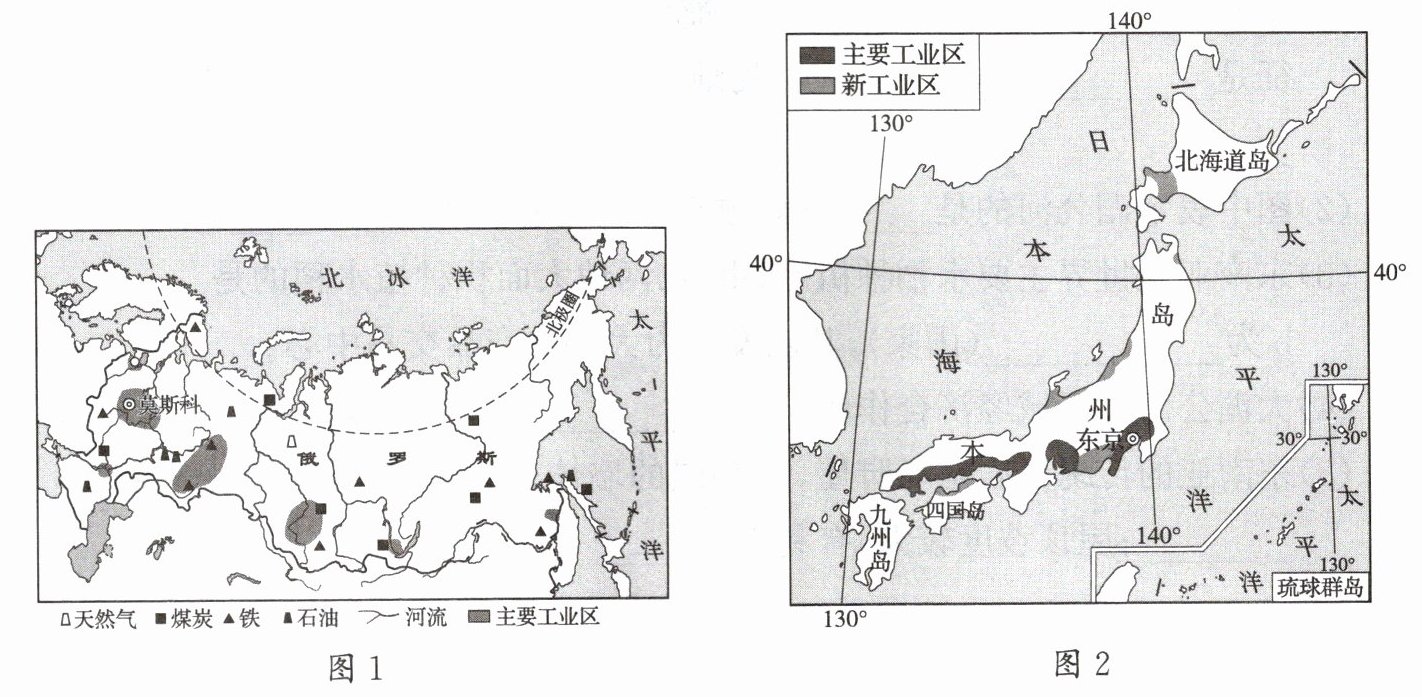16. 俄罗斯与日本是隔海相望的两个国家,人口均超过1亿。读俄罗斯工业区分布图(图1)和日本工业区分布图(图2),完成下列各题。