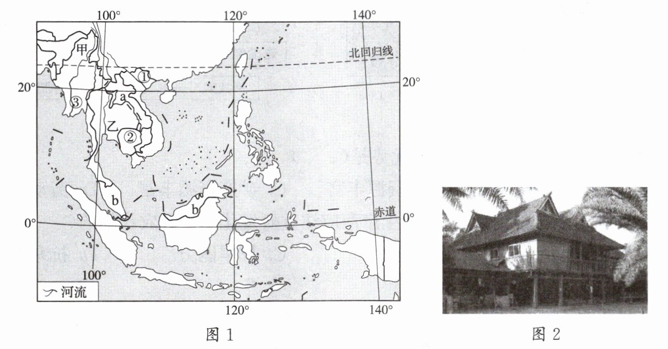 17. 大湄公河次区域包括澜沧江—湄公河流域内的中国、柬埔寨、老挝、缅甸、泰国和越南六国。随着大湄公河次区域经济合作的不断深化,我国与周边国家加强农业合作,共同建设农业生产基地、大宗农产品交易中心、仓储中心和配送体系。读东南亚地区图(图1)和东南亚传统民居图(图2),完成下列各题。