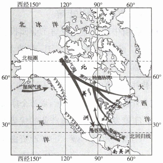 (2024·江苏宿迁中考)在北美洲中部,冬季寒冷气流可到达墨西哥湾沿岸。读北美洲地形对气候的影响示意图,完成 5~6 题。
