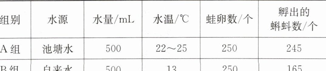(1) B组的孵化率较低,原因主要有两个方面:一是自来水中的氯气对蛙的胚胎发育有