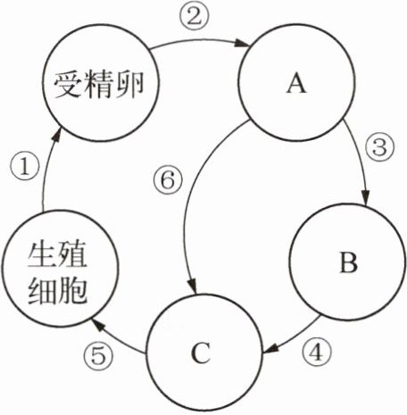 12. 将相关联的知识以概念图的方式直观形象地表达,是研究和学习的一种重要方法。下面的概念图中,①~⑥表示生殖发育过程,A、B、C表示发育时期。请据图回答问题。