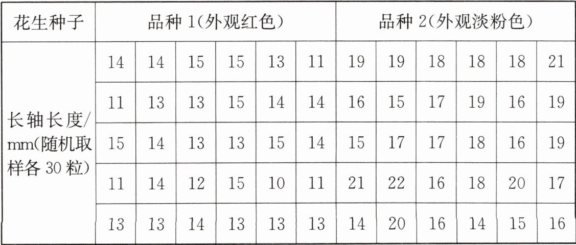 13. 下表是某学习小组探究花生种子大小的变异所测得的数据,请据表回答问题。