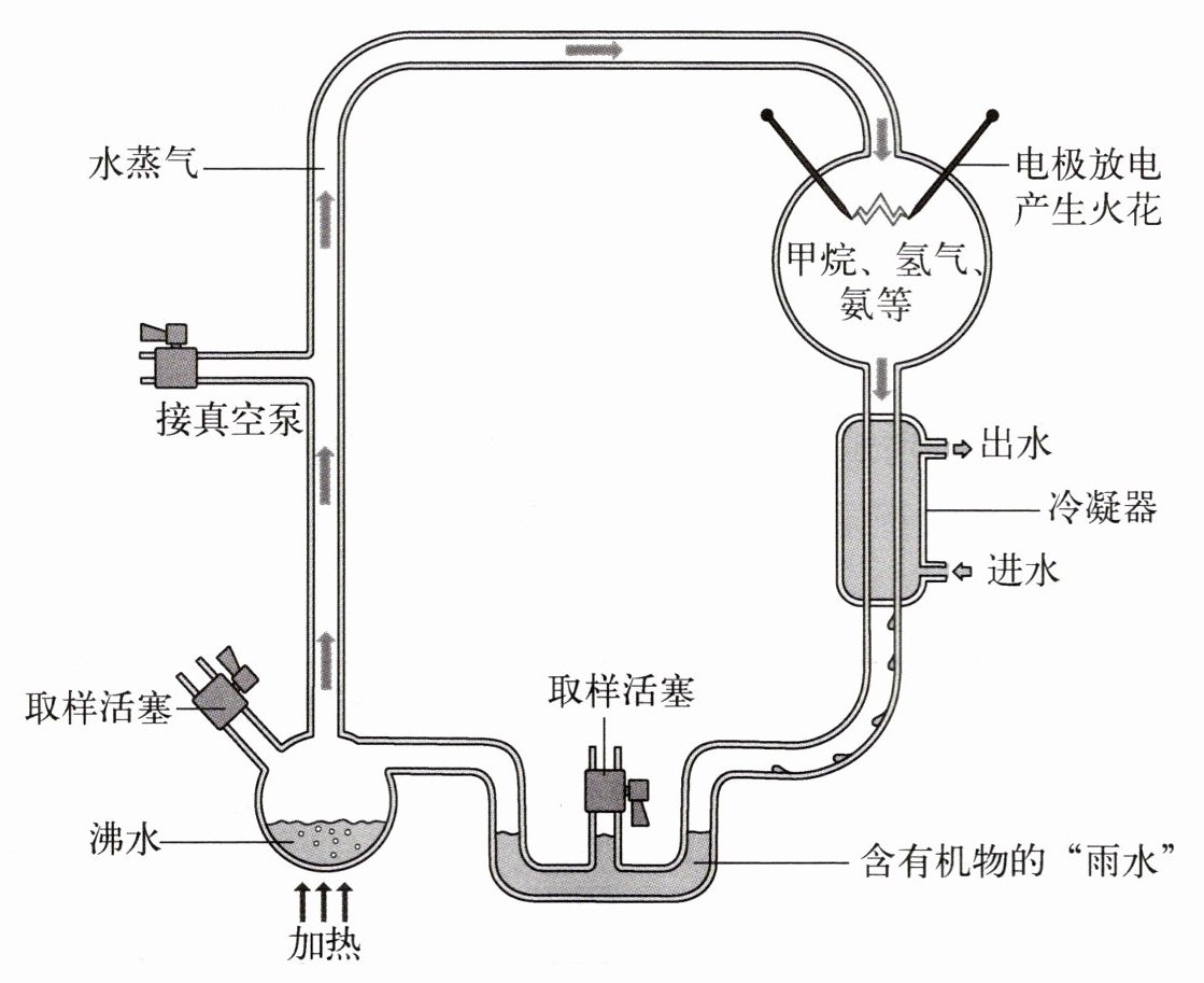(1)实验装置中两个电极放电产生火花,模拟了原始地球上什么样的自然条件?