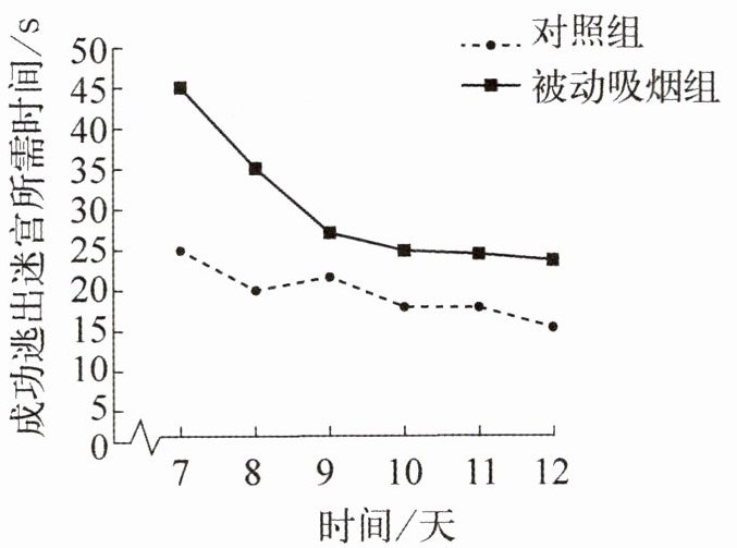 8. 为了探究“被动吸烟对仔鼠学习记忆力的影响”,某研究团队训练仔鼠走迷宫,从第 7 天开始记录仔鼠逃出迷宫所需时间,结果如下图所示。下列叙述中,正确的是(