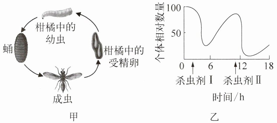 (2)图乙中,使用杀虫剂Ⅰ后,实蝇的数量急剧减少的主要原因是在生存竞争中没有抗药性的个体大量被淘汰,但数量没有降到零的主要原因是实蝇群体中少量具有