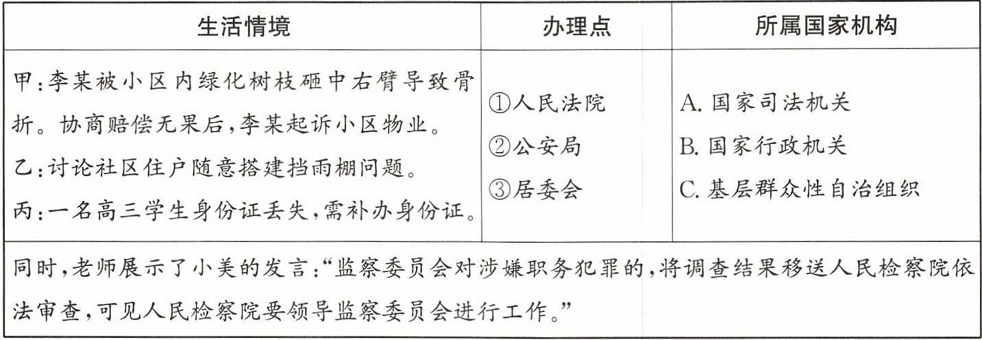 请你对“生活情境”“办理点”“所属国家机构”的内容进行正确推导,并运用我国国家机构的相关知识对小美同学的发言进行辨析。
