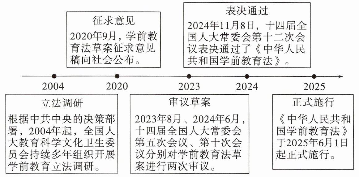 14. 针对学前教育“人园难”“人园贵”的问题,我国出台了《中华人民共和国学前教育法》,该法于 2025 年 6 月 1 日起正式施行。下图展示了《中华人民共和国学前教育法》的立法过程。