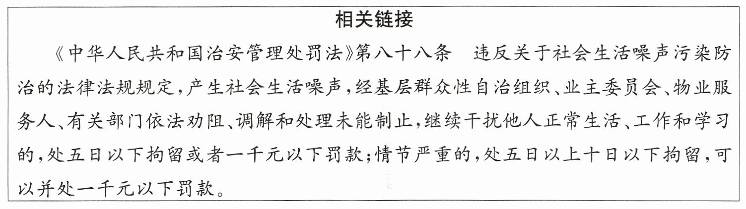 答案:5. 合理。因为李大爷等业主享有休息权。公民的权利与义务相统一;权利的实现需要义务的履行,义务的履行离不开权利的实现;公民既是权利的享有者,又是义务的承担者;公民要增强权利意识和义务观念,依法行使权利,自觉履行义务。另外,公民必须遵守宪法和法律,尊重社会公德,遵守公共秩序。