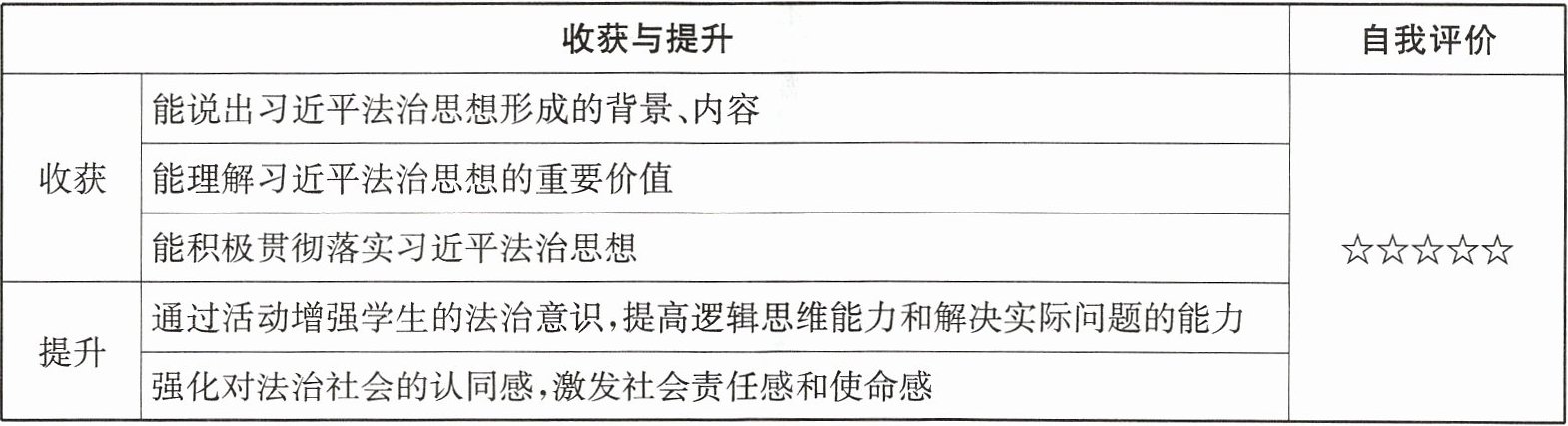 通过学习,我们已经学习了全面依法治国的指导思想——习近平法治思想。班里将开展研学实践活动,使参与者在享受学习乐趣的同时,深刻体会到法治精神的价值。这一活动,需要你结合所学知识和小组成员一起设计活动内容并积极参与,然后在班里进行展示。