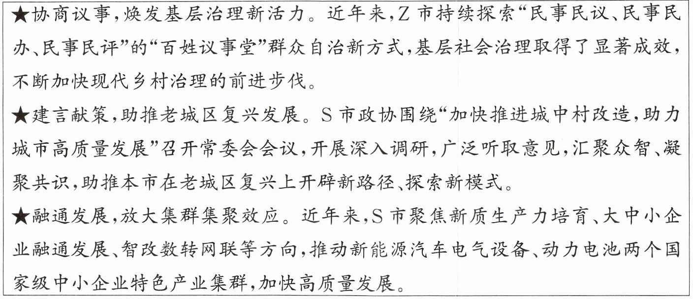 答案:13. ①Z市探索“百姓议事堂”群众自治新方式,彰显了基层群众自治制度的优势,促进基层社会治理,推动现代乡村治理发展。②S市政协开展调研、听取意见,彰显了中国共产党领导的多党合作和政治协商制度的优势,汇聚各方智慧,为城市高质量发展建言献策。③S市聚焦新质生产力培育,推动大中小企业融通发展和特色产业集群建设,彰显了社会主义基本经济制度中公有制为主体、多种所有制经济共同发展和社会主义市场经济体制的优势,激发各类经营主体活力,促进经济高质量发展。