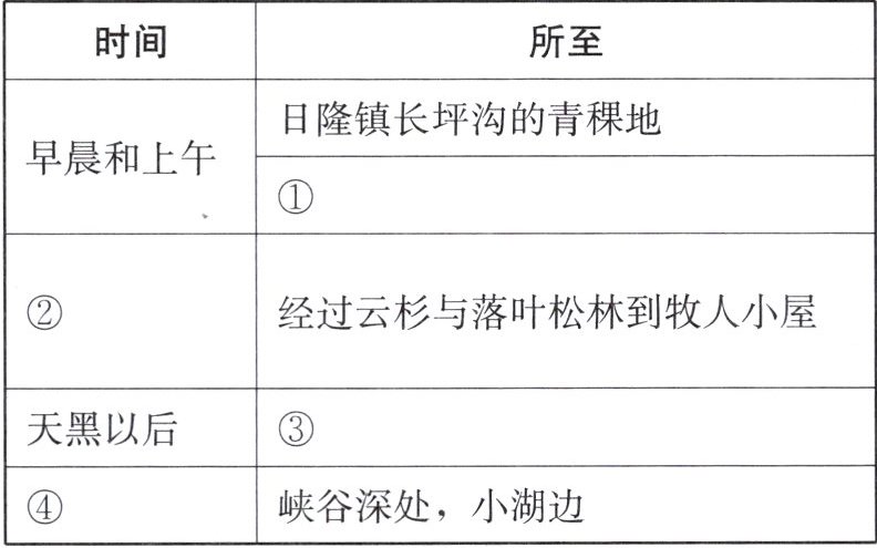 1. 通读全文,梳理时间和游踪的变化,完成下面的表格。