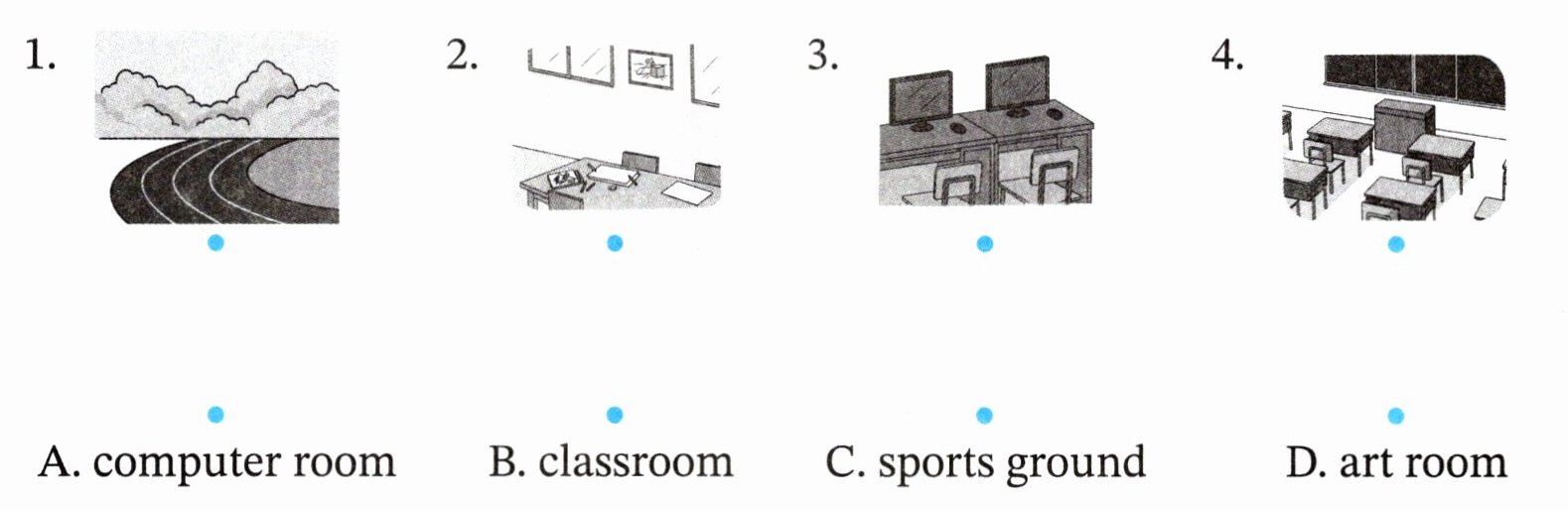 1. 图片1为跑道和操场,对应C. sports ground;2. 图片2有画架和绘画工具,对应D. art room;3. 图片3有电脑和桌椅,对应A. computer room;4. 图片4有黑板和课桌椅,对应B. classroom。