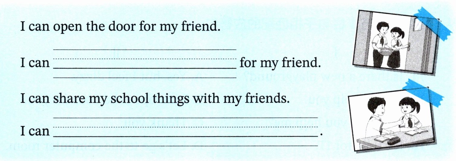 题目要求模仿例句写出在学校能帮助朋友做的事情,例句中使用了 "I can open the door for my friend." 和 "I can share my school things with my friends." 的结构。根据图片提示,第一幅图是帮忙拿书,可以写成 "I can carry the books for my friend.";第二幅图是借给朋友铅笔,可以写成 "I can lend my pencil to my friend."。
