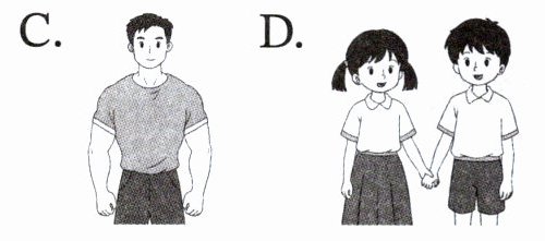 1. 句子 "My dad is very strong." 意思是“我爸爸非常强壮”,应选择表示强壮的成年男性图片,对应选项 C。