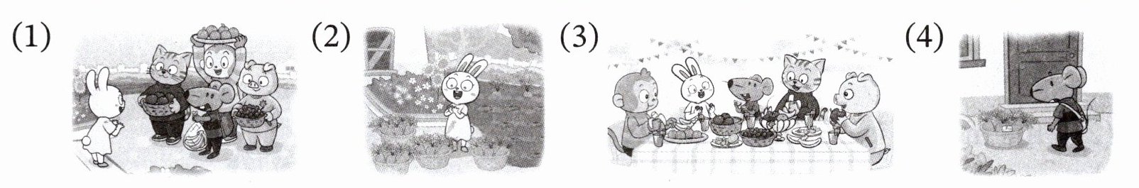 图(1)中动物们拿着水果,对应“我们想和你分享我们的水果”(C);图(2)兔子在胡萝卜地,胡萝卜数量多,对应“有很多胡萝卜”(B);图(3)动物们吃水果,对应“水果很甜”(D);图(4)小老鼠看到少量胡萝卜,对应“有一些胡萝卜”(A)。