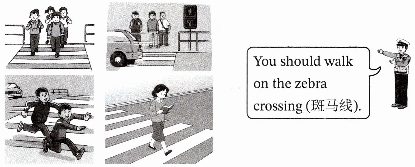 答案:例子已给出:You should walk on the zebra crossing (斑马线).