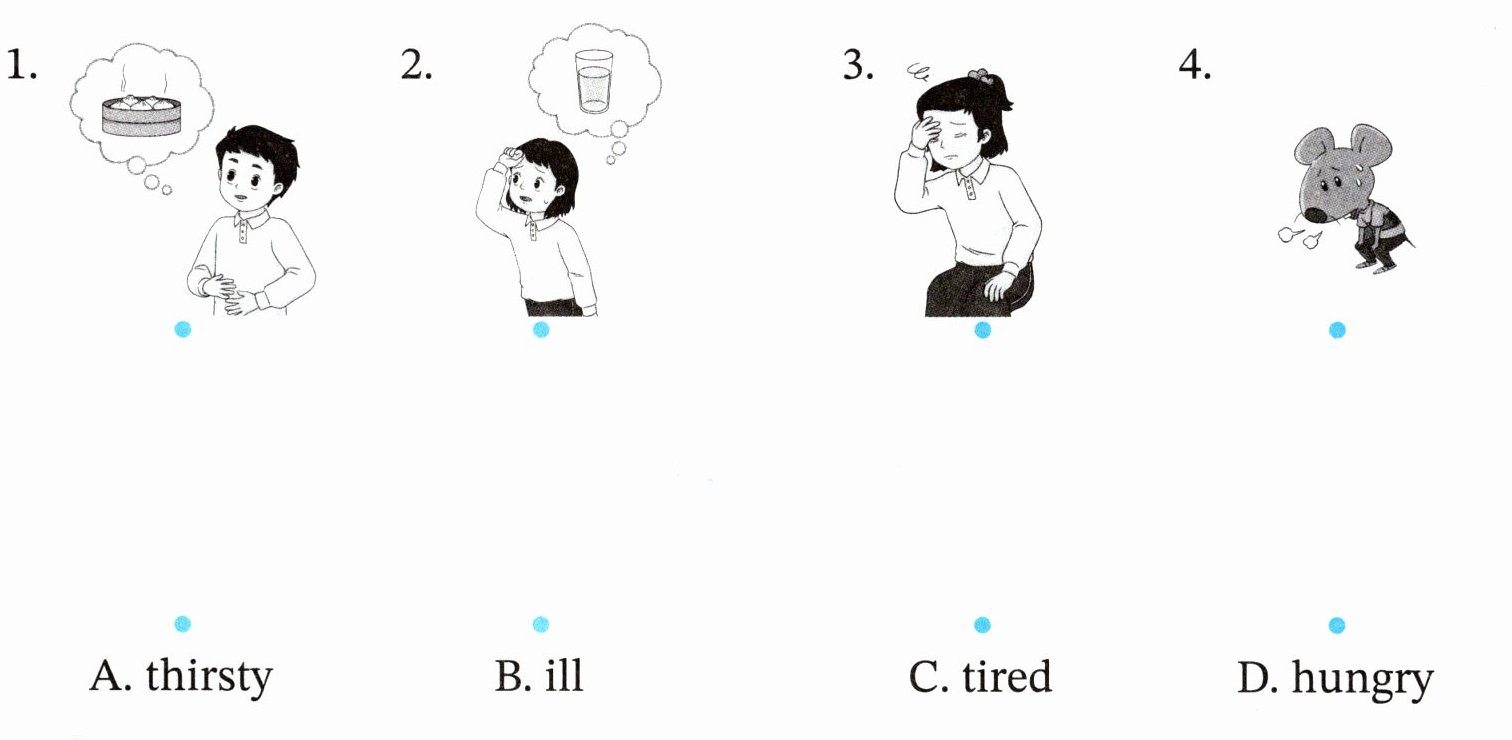 1. 图中男孩想食物,对应D(hungry);2. 图中女孩想水杯,对应A(thirsty);3. 图中女孩摸头,对应B(ill);4. 图中老鼠流汗喘气,对应C(tired)。